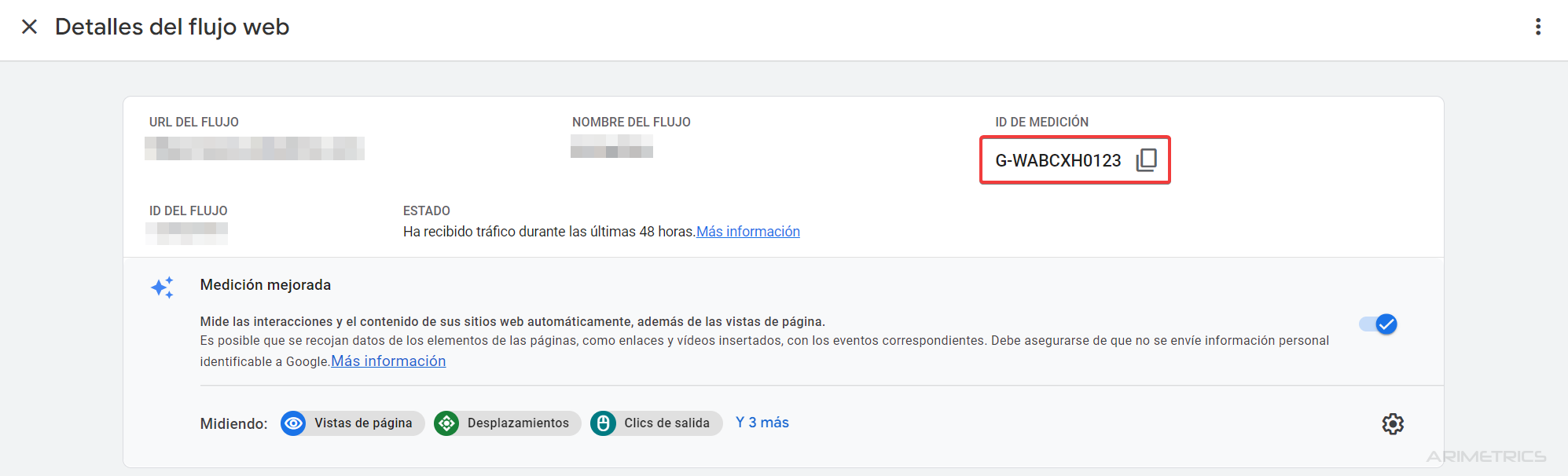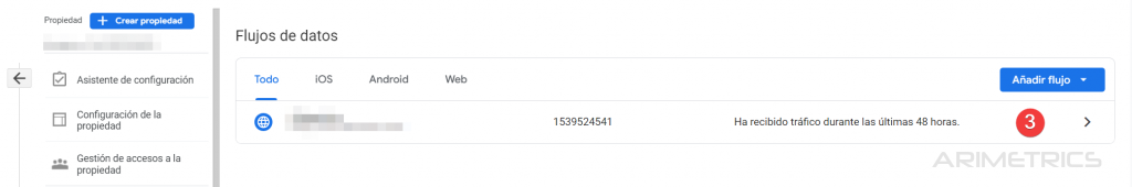 Vamos a Administrar -> Flujos de datos -> Clic en el flujo web y anotamos el ID de medición