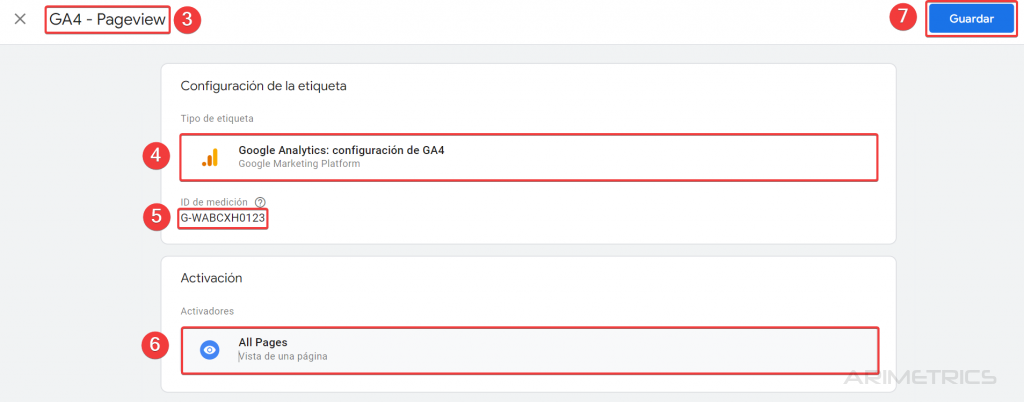 - Ponemos el nombre a la etiqueta (GA4 – Pageview)