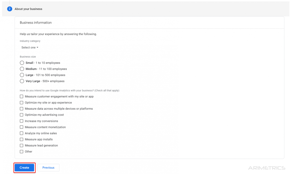 The fields in this step (company information) are optional. We can fill them in or go directly to the “Create” button