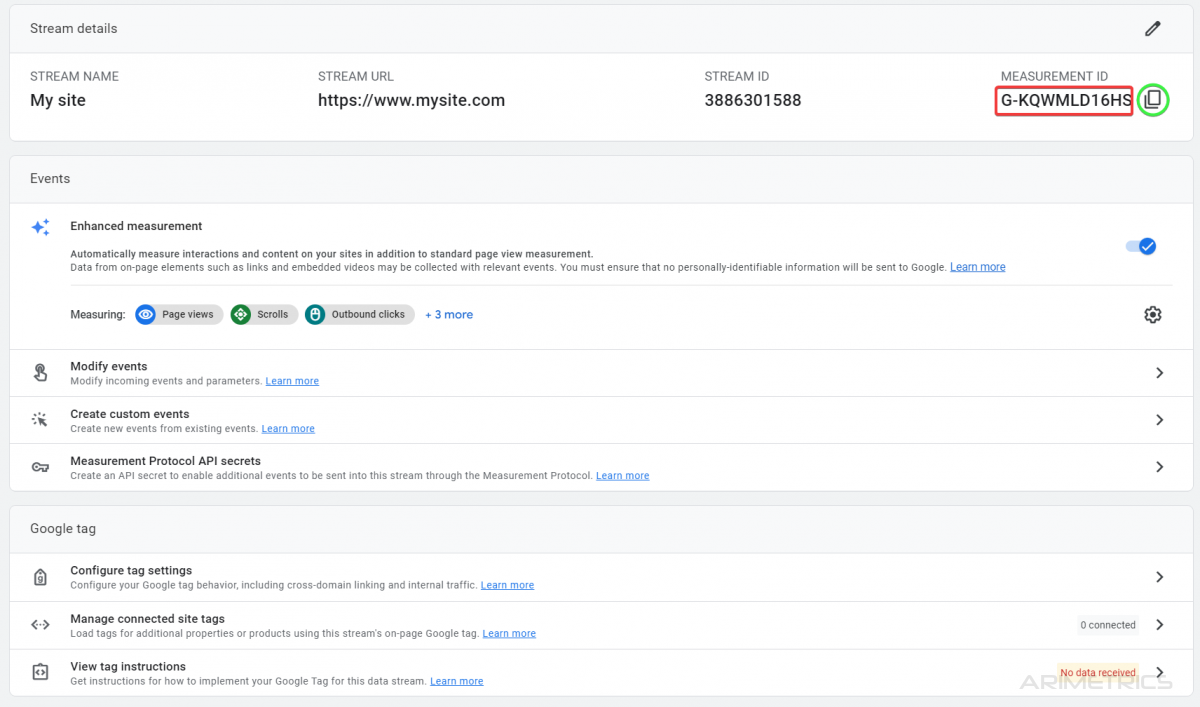 Below we are shown the measurement ID that we will need to install Google Analytics 4 with Google Tag Manager or with different modules of the CMS of our website, or the code that can be placed directly in the HTML of the web.