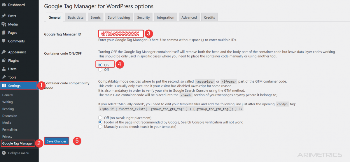 - Insert the code “GTM-XXXXXXX” from the Google Tag Manager Container (Change XXXXXXX with the provided code)