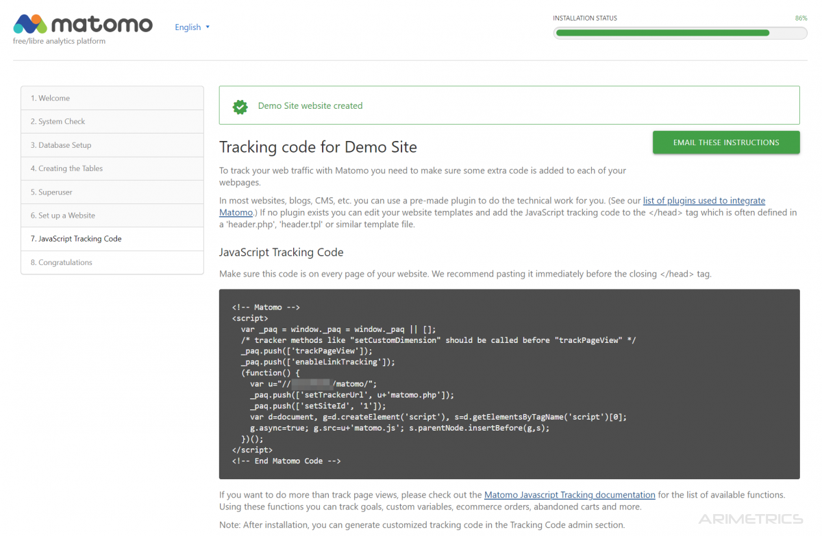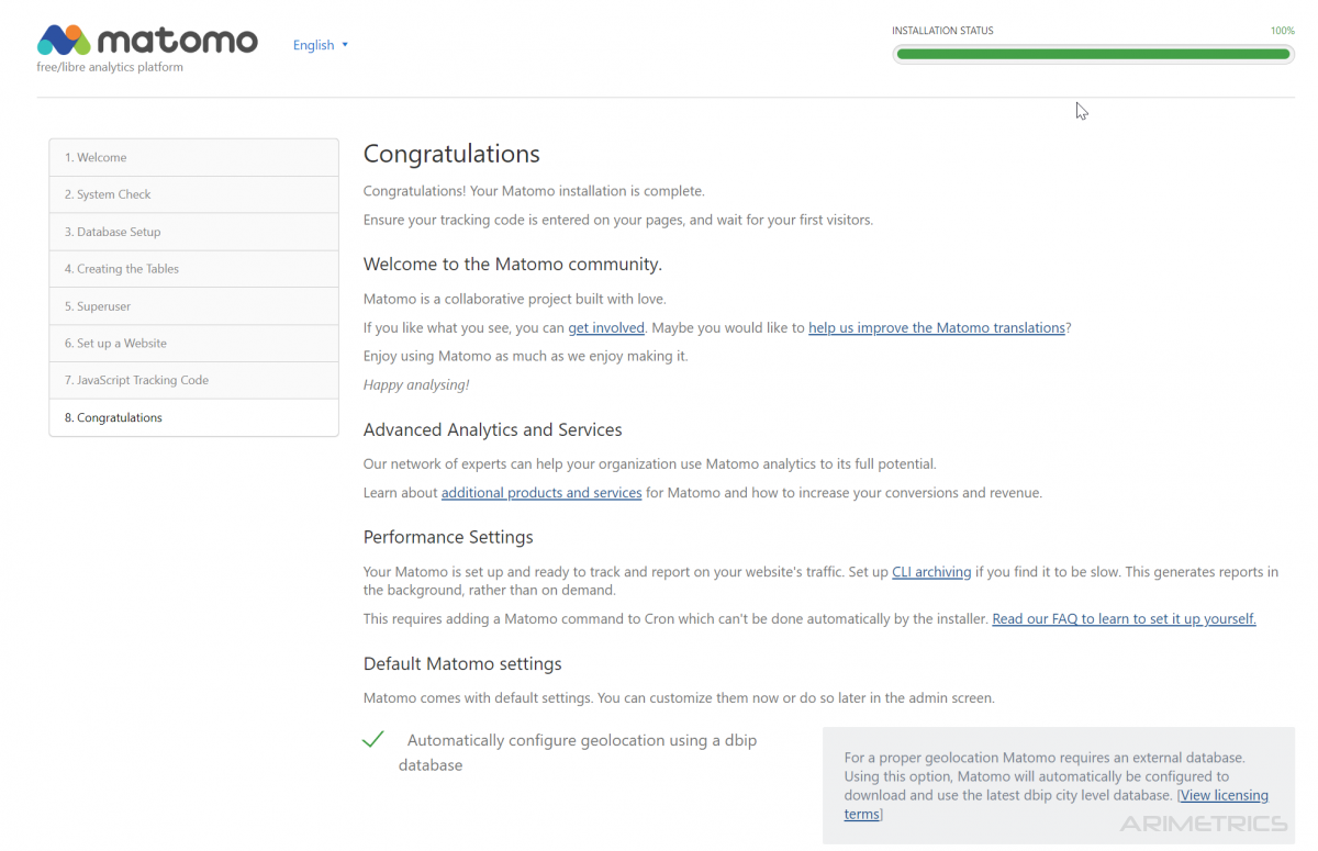 If everything has gone well, we come to the final page of the installation: We are ready to enter our new web analytics tool.