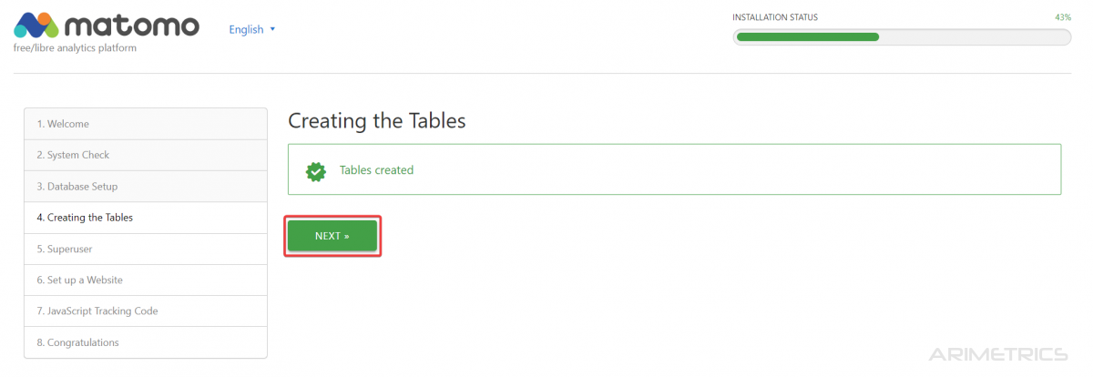 If everything has gone well (surely yes), the database tables will be created automatically and you can move on to the next step