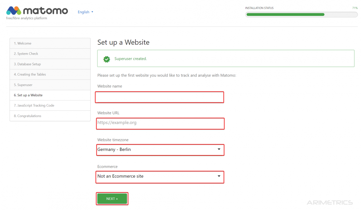 It is time to create the Super User: the user who will have all the admin permissions within the Matomo installation.