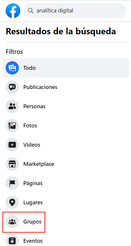 Tras realizar la búsqueda, filtramos los resultados. Por defecto, Facebook desplegará diferentes opciones: publicaciones, personas, fotos… Marcamos la pestaña de Grupos para descubrir las diferentes comunidades de las que podemos formar parte.