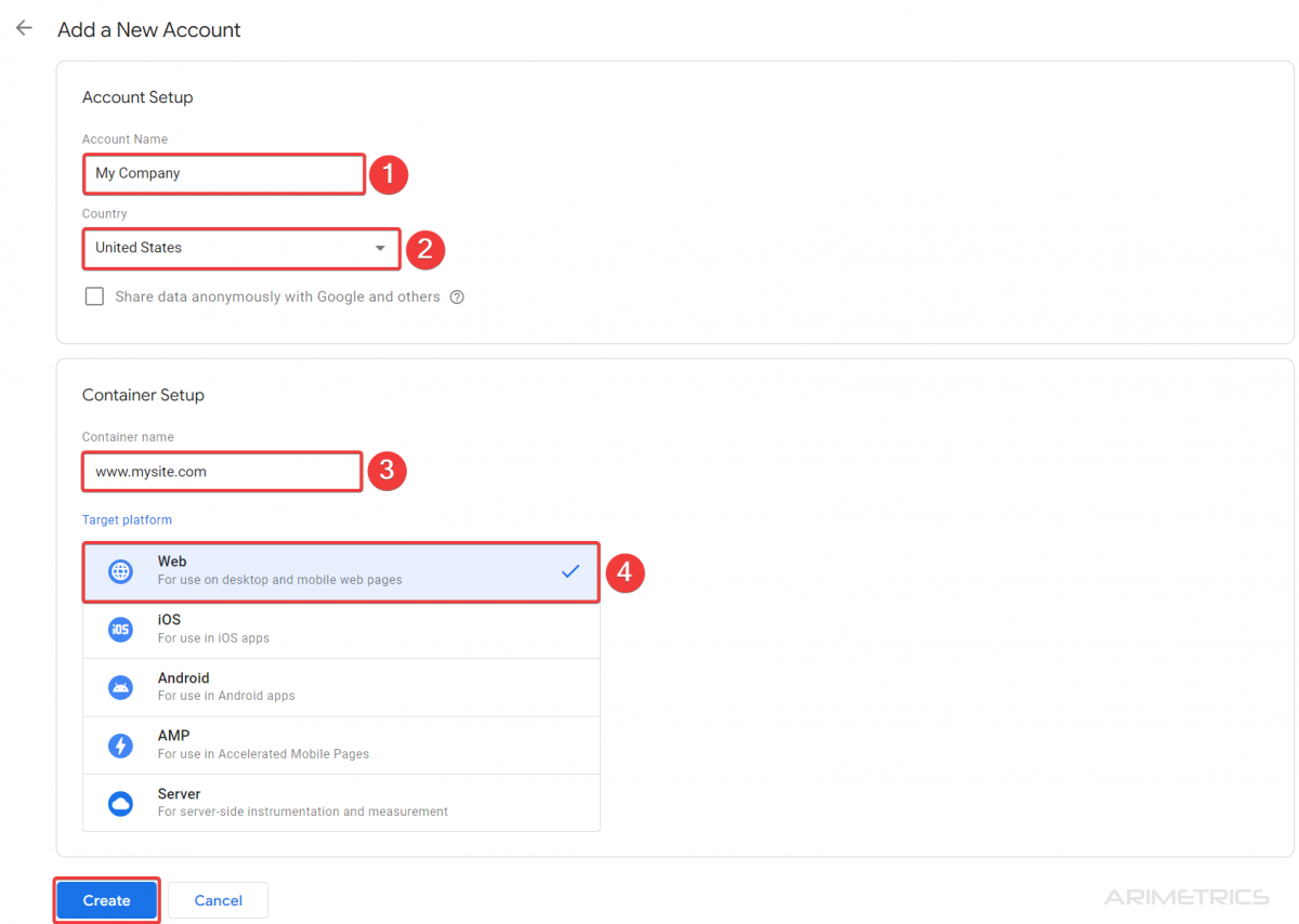 To create a container in Google Tag Manager, you need to have a Google, Gmail, or Google Workspace account.