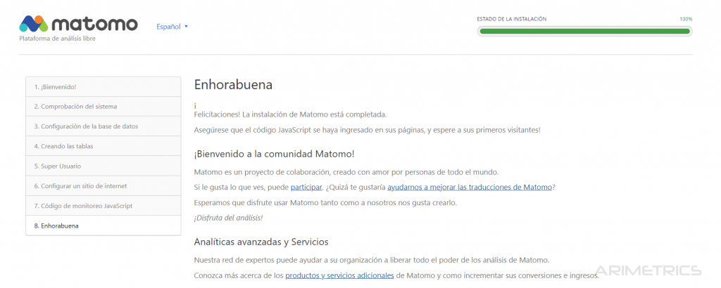 Si todo ha ido bien, llegamos a la página final de la instalación: Ya estamos listos para entrar en nuestra nueva herramienta de analítica web.