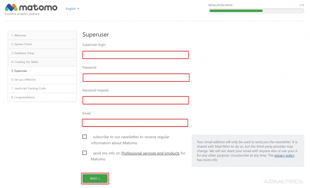 It is time to create the Super User: the user who will have all the admin permissions within the Matomo installation.