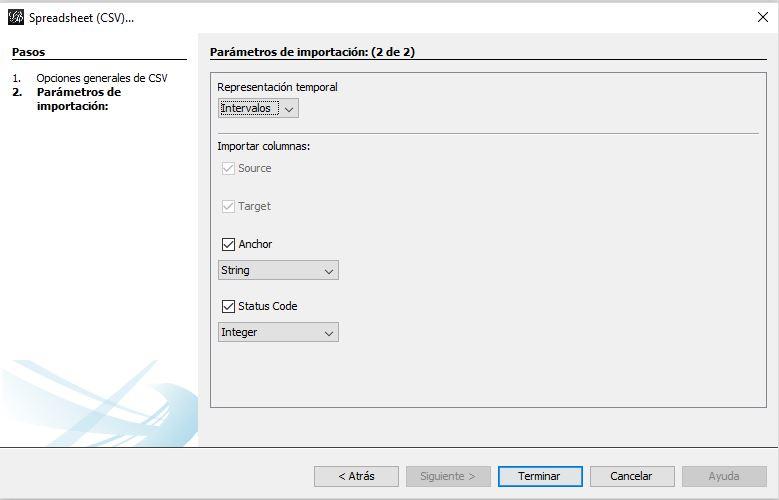 - Continuamos con la configuración preestablecida (separado por comas, tabla de aristas y UT8)